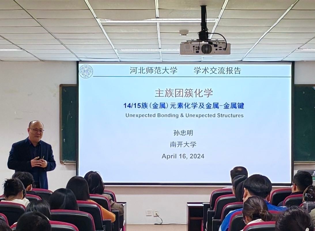 2024年4月17日上午,南开大学材料科学与工程学院教授孙忠明应天游8线路检测中心邀请,在理科群7号楼C118会议室做了题为“主族团簇化学——14/15族(金属)元素化学及金属-金属键”的专题讲座。报告会由韩占刚教授主持,相关专业领域教师、研究生100余人参加了本次学术报告会。